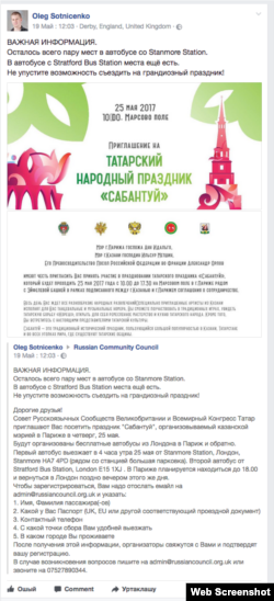 В то же время татарские активисты, не связанные с Россотрудничеством, даже не знали о том, что Конгресс предоставил автобус для поездки из Лондона в Париж. Диана Яхина из Лондона, например, попросила поделиться информацией о запланированных татарских мероприятиях не в каких-то закрытых просоветских сообществах, но и в группе "Tatarlar in the UK" в Facebook, она о предстоящей поездке во Францию узнала слишком поздно.