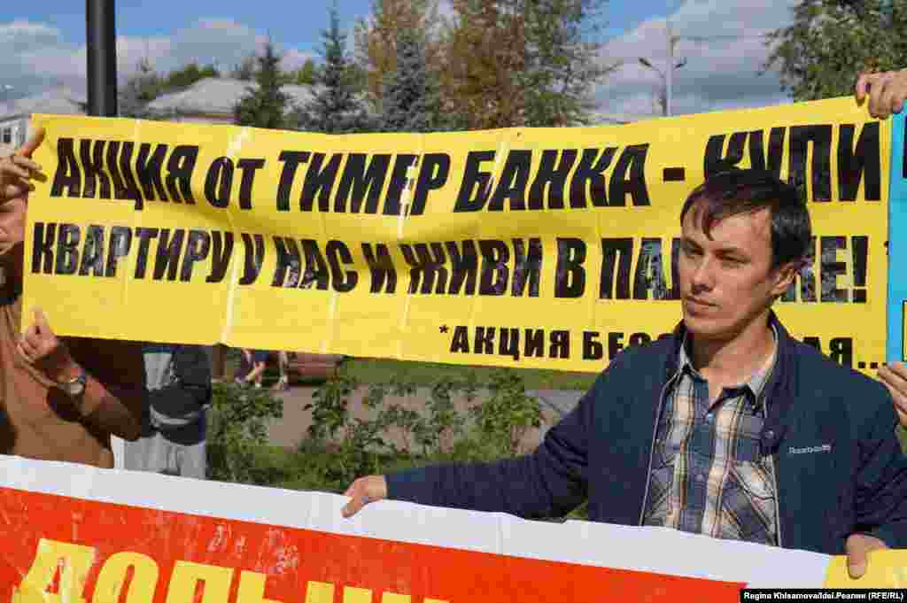"Казань — столица обманутых дольщиков!", "Мы хотим в свой дом!", "Президент РТ, спасибо вам за мое бездомное детство", "Ждем возобновления строительства", "Наши дети тоже хотят жить в своих квартирах" — с такими плакатами вышли митингующие. Смотрите другие наши фотогалереи здесь.