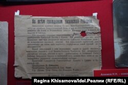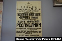 — На этой стене закреплена роскошная карта под названием "Триумфальное шествие Советской власти. Октябрь 1917 — март 1918 года". А в витрине под ней показан эпизод татарского национального строительства этих же месяцев — попытка провозглашения штата Идель-Урал. Провозглашение не состоялось из-за противодействия казанских большевиков, что зафиксировано в воззвании никогда не существовавшей Казанской республики. Удалившиеся в Татарскую слободу деятели так называемой "Забулачной республики" заседали в доме Юнусова, фото которого здесь же. Разгонял "Забулачку", в том числе, экипаж броневика, запечатленного на еще одной фотографии. Фото в музей сдал лично шофер бронеавтомобиля Василий Федорович Балаев, и кроме этой фотографии, он подарил и отражатель от броневика. На открытие выставки приходил внук Балаева, он очень гордился дедом.