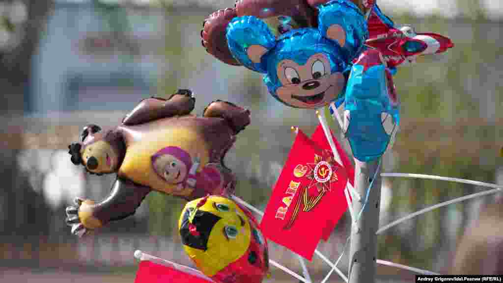 Пилотки соседствуют с красными флажками с надписями "9 мая", над флажками — грозди воздушных шариков с мультяшными персонажами. Преобладают американские герои. Микки Маус, Винни-Пух (явно не из российской анимационной версии); сбоку, правда, нашлось место и для Маши с медведем.