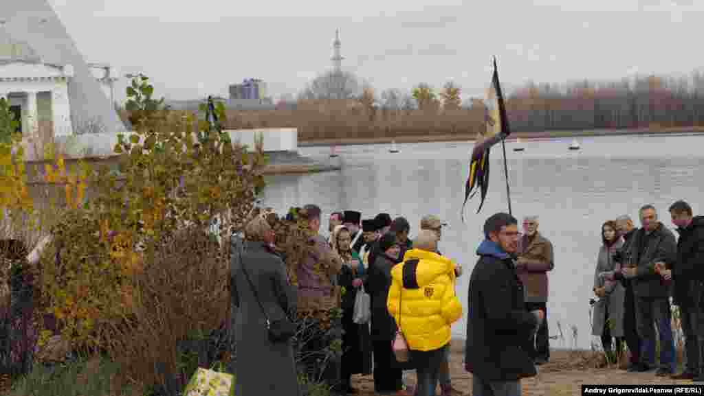 После окончания молитвы небольшая группа верующих во главе с председателем Общества русской культуры РТ Михаилом Щеглов добралась до храма-памятника, на катере, предоставленном МЧС.