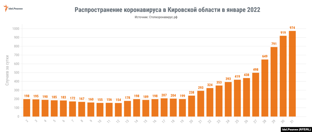 Самый большой рост суточных заражений за месяц показала Удмуртия. Если в начале января было 52 случая за сутки, в конце января — уже 1351. Рост в 26 раз. Следом идут Чувашия (рост в 13,2 раза) и Оренбургская область (в 10,2 раза).