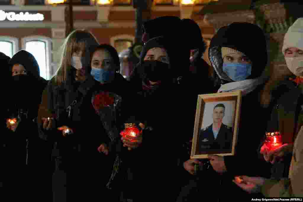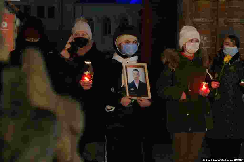 У них были цветы, свечи и портрет первого официально признанного погибшим контрактника из Татарстана — уроженца Нижнекамска Ильнура Сибгатуллина.