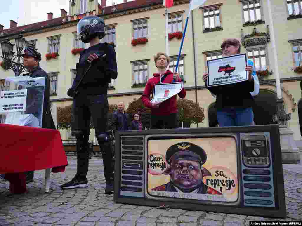 С начала нападения РФ на Украину россияне, живущие во Вроцлаве, проводят у городской ратуши театрализованные акции протеста. Очередная, в сентябре, была посвящена минувшим российским выборам. Участники постановки предлагали прохожим проголосовать.