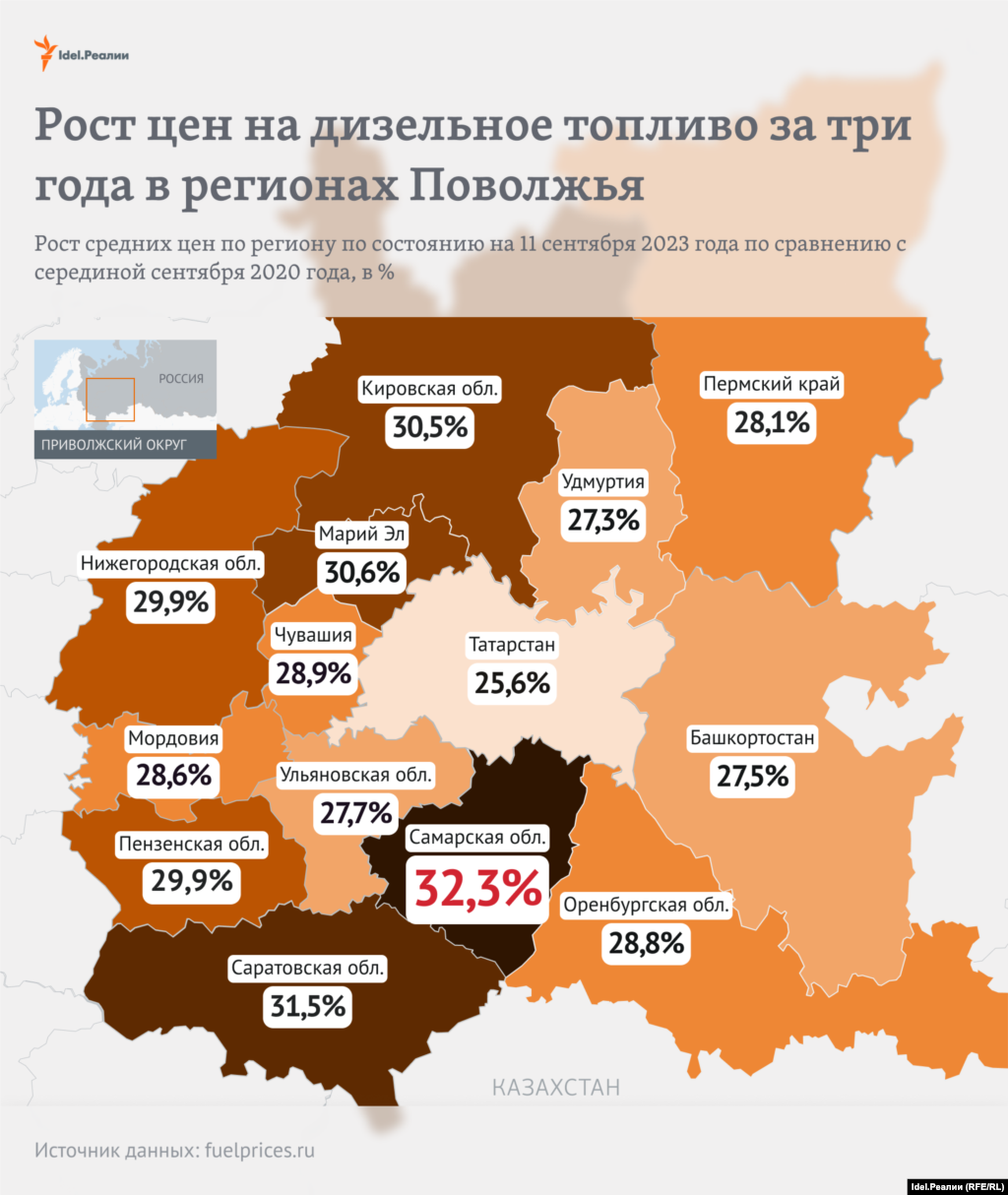 Что касается дизельного топлива, то он подорожал сильнее всего также в Самарской области — сразу на 32,3%. На втором месте по росту Саратовская (31,5%) и Кировская области (30,5%).