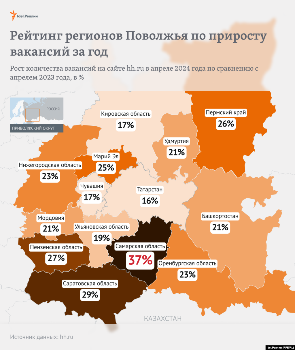 "Idel.Реалии" составили рейтинг регионов ПФО по росту вакансий за год на основе исследования портала hh.ru.