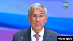 Выступает Рустам Минниханов. Делегаты встретили его стоя.
